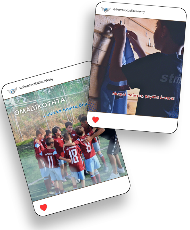 Στους Strikers (παιδική ακαδημία ποδοσφαίρου) αναπτύξαμε ένα περιεχόμενο που απευθύνεται τόσο στα παιδιά όσο και στους γονείς, με ισορροπία ανάμεσα στη ζωντάνια, την ενημέρωση και τον σεβασμό προς το άθλημα.